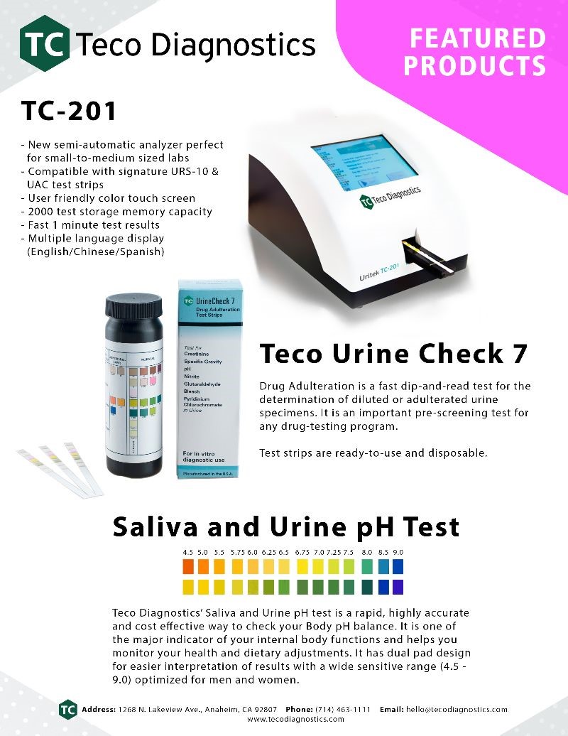 TC-201 Semi-automated urine strip reader. 60 tests per hour. LCD Touchscreen. 2,000 tests memory. Thermal Printer. USB data transfer. Barcode and LIS capable. Interface: English, Chinese and Spanish.
